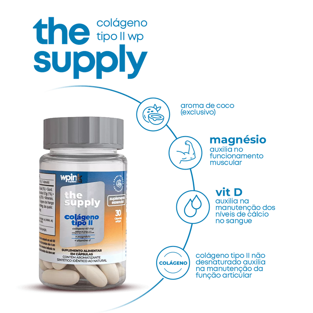 - O uso combinado de colágeno tipo II + vitamina D + magnésio, é uma fórmula específica, que auxilia na manutenção da função: das articulações, óssea e muscular.