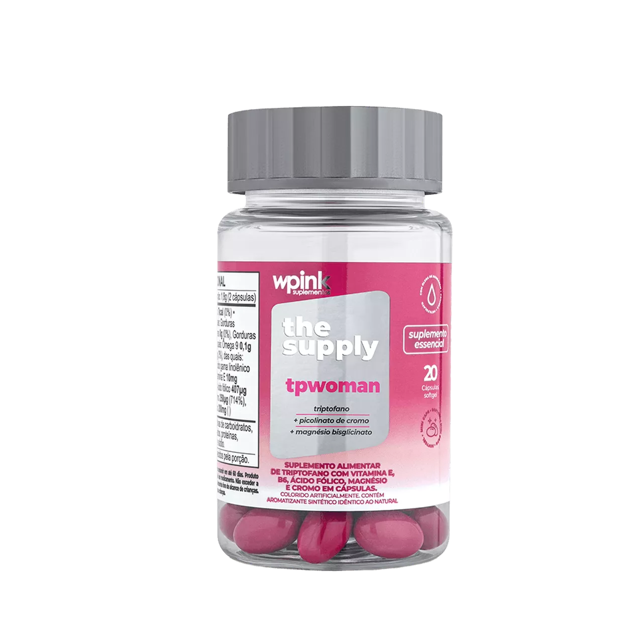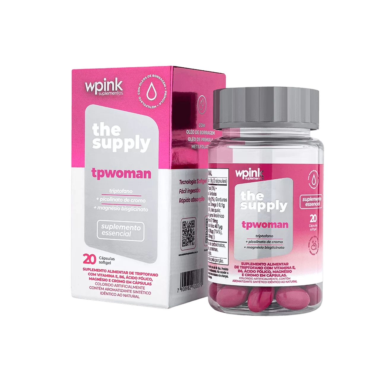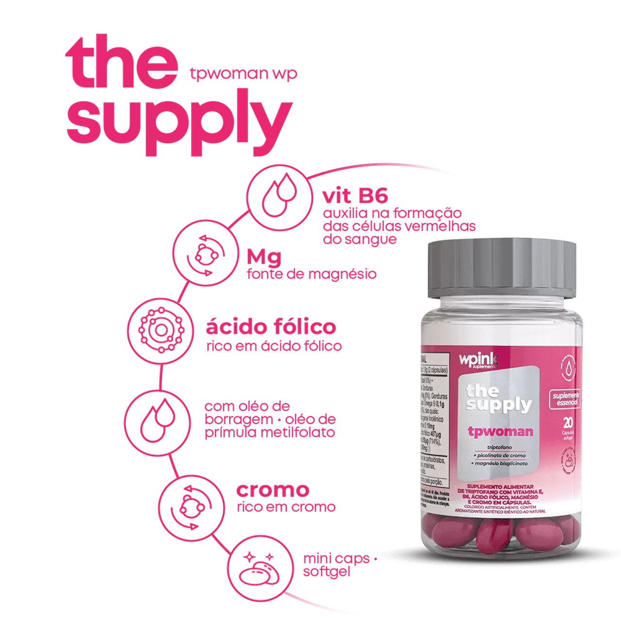 Suplemento alimentar para mulheres, com óleo de borragem, óleo de Prímula, ácido gama-linolênico, triptofano, cromo e magnésio, auxiliam a mulher que deseja suporte nutricional antes e durante o ciclo.